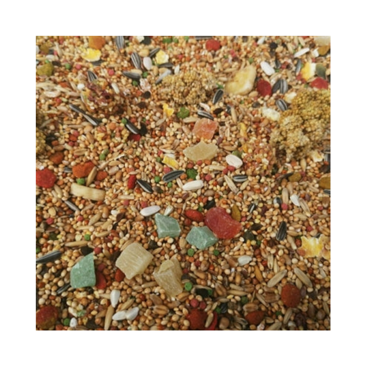 Hareco Pyrrhura Select Pellet-Free is a luxurious seed mixture specially formulated for Pyrrhuras. This variety contains no added pellets and is richly packed with nutriberries, a mixed vegetable, goji berries, mixed berries, panicle millet, fruit cubes, banana chips, and coconut flakes. The mixture is also enriched with a carefully selected herb mix including aniseed, nettle, chervil, rosehip, and rosemary. Also suitable for cockatiels and other Australian and South American parakeet species.