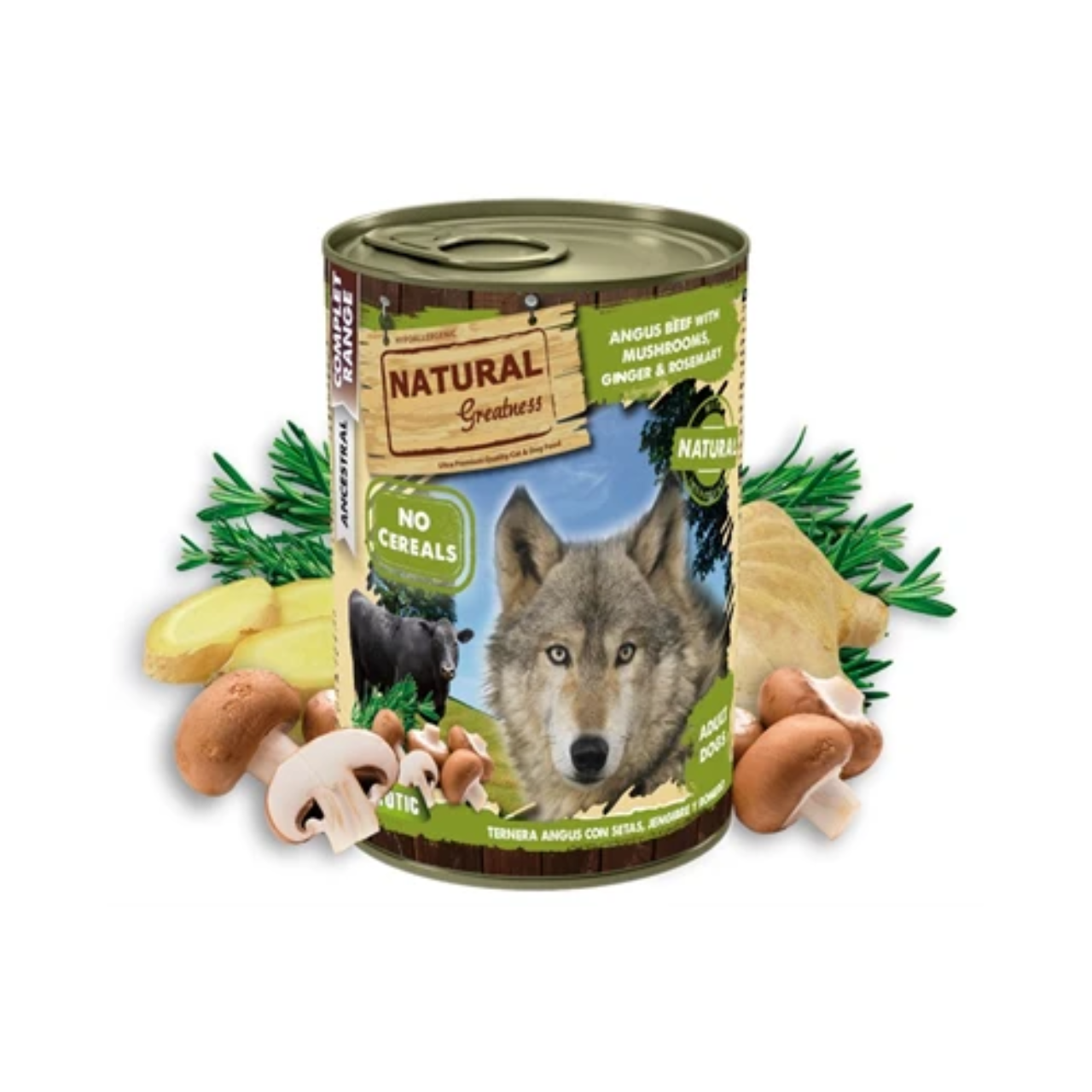 Natural Greatness Angus Beef / Mushrooms / Ginger / Rosemary is a complete wet food for adult dogs , with a rich flavor and low fat content. It's ideal for picky dogs or dogs prone to weight gain .