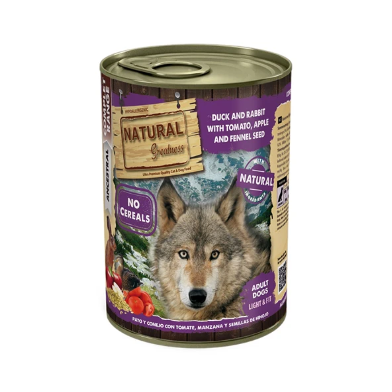 Natural Greatness Duck/Rabbit/Tomato/Apple/Fennel Seeds is a complete, grain-free wet food for adult dogs. It combines duck and rabbit meat with healthy additions like apple, tomato, and fennel seed for a tasty and nutritious meal. This food supports healthy digestion and is free from artificial additives, sugars, and fillers.