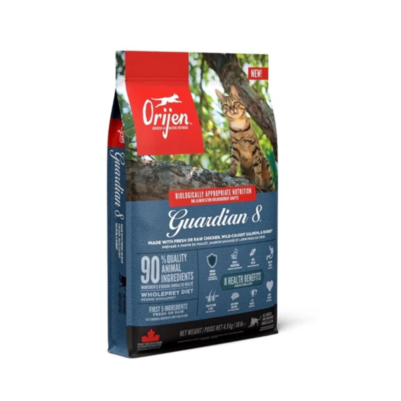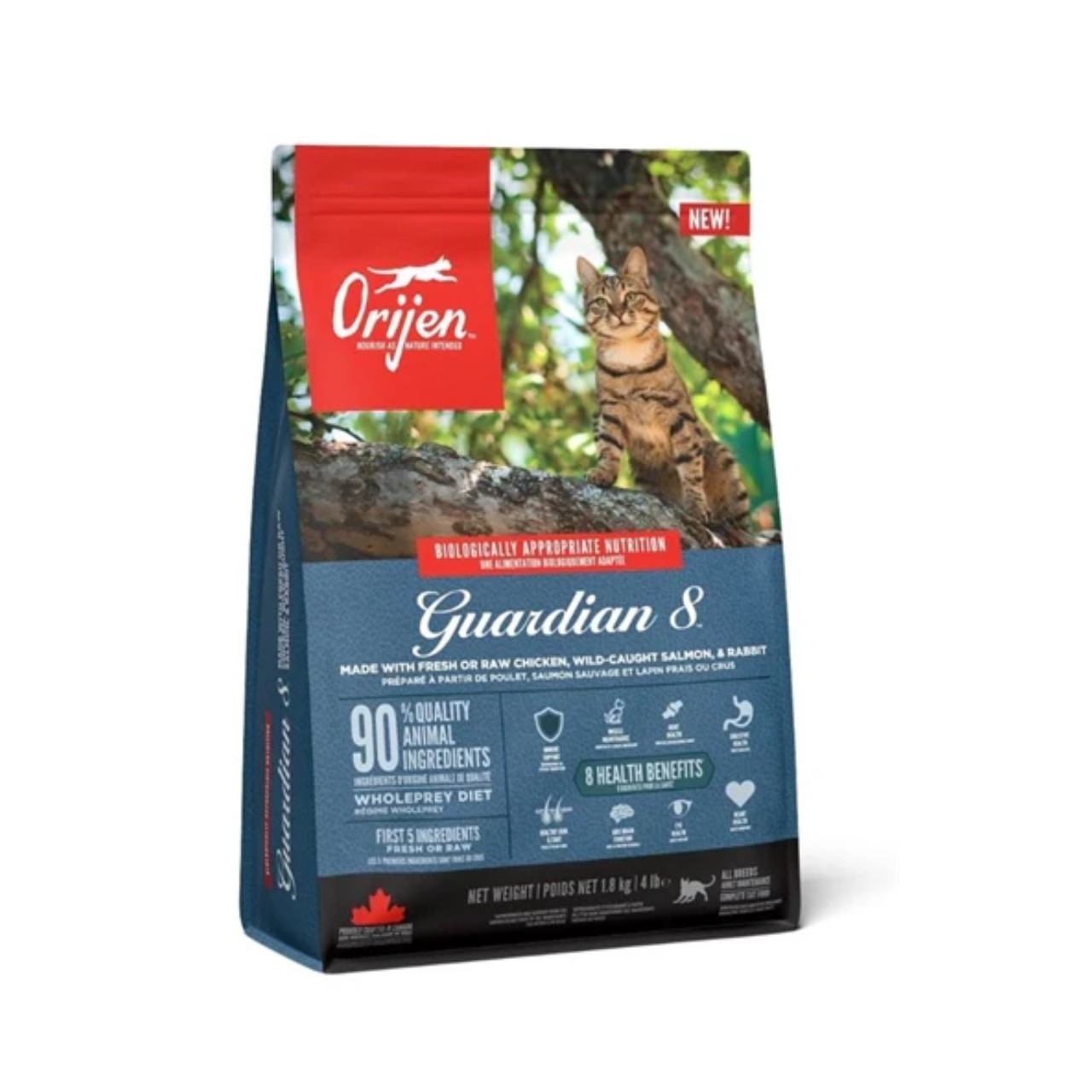Orijen Guardian 8 Cat is a premium cat food made with 90% high-quality animal ingredients , including fresh chicken, turkey, fish, and organ meat. This food is specially formulated to support your cat's overall health in eight key areas : immune system, digestion, coat and skin, muscles, heart, joints, brain, and eyes.
