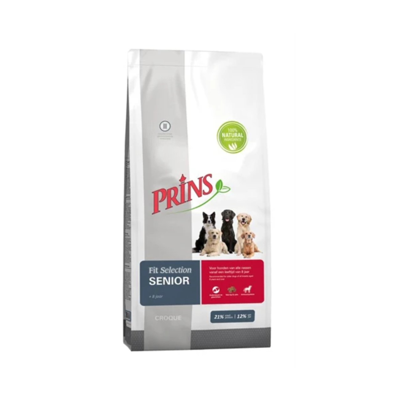 Prins Fit Selection Senior is a crunchy, balanced food specially developed for senior dogs of all breeds (approximately eight years and older). The crunchy chunks encourage chewing and support healthy digestion and a balanced intestinal flora , keeping your dog fit and healthy. Enriched with high-quality proteins from chicken and salmon, and with glucosamine and chondroitin for joint support, this food is ideal for senior dogs.
