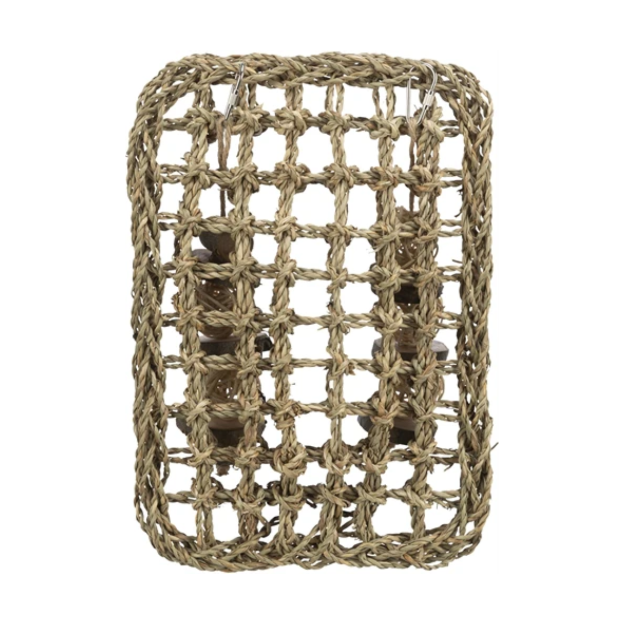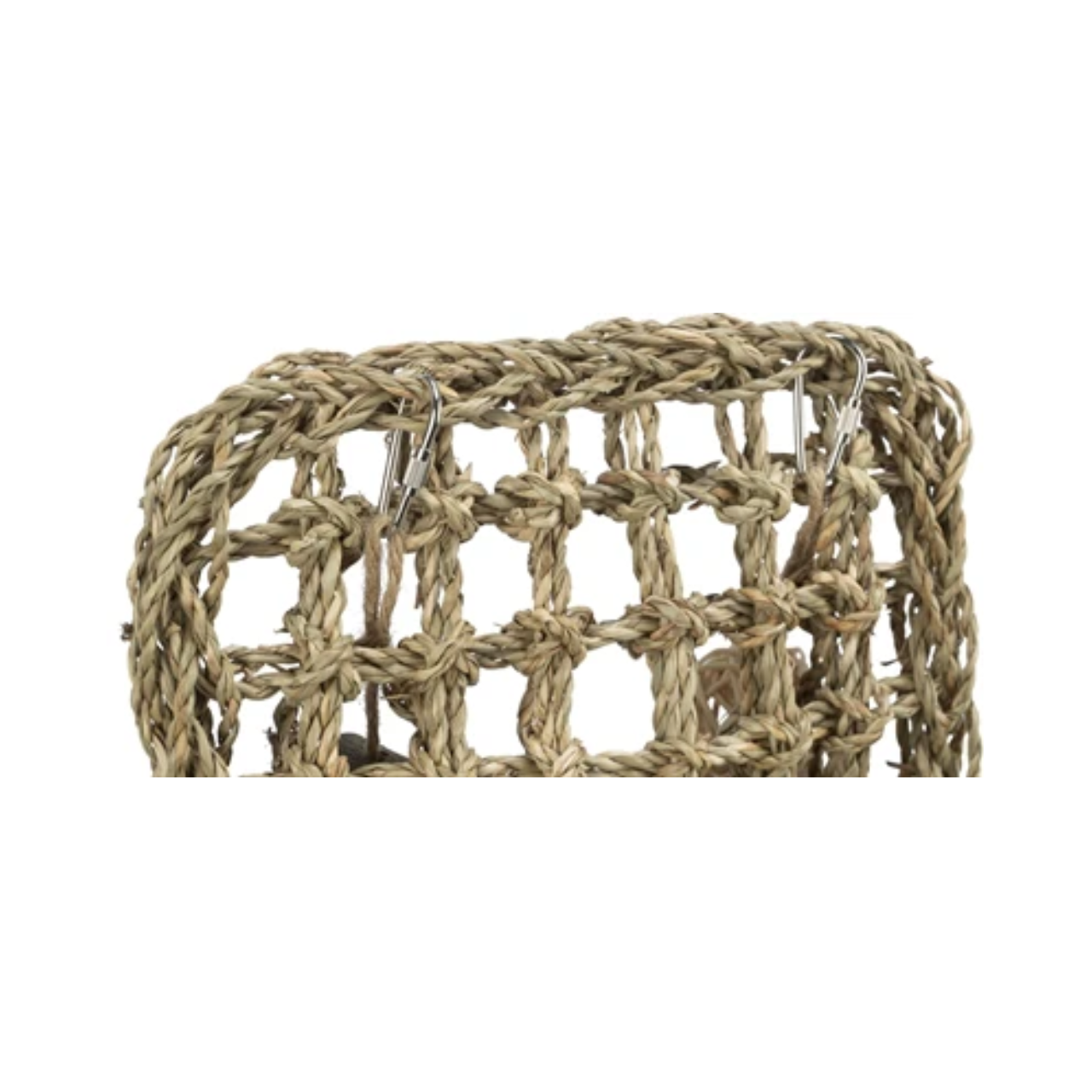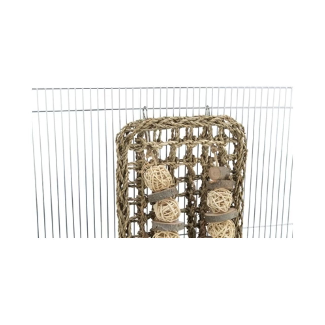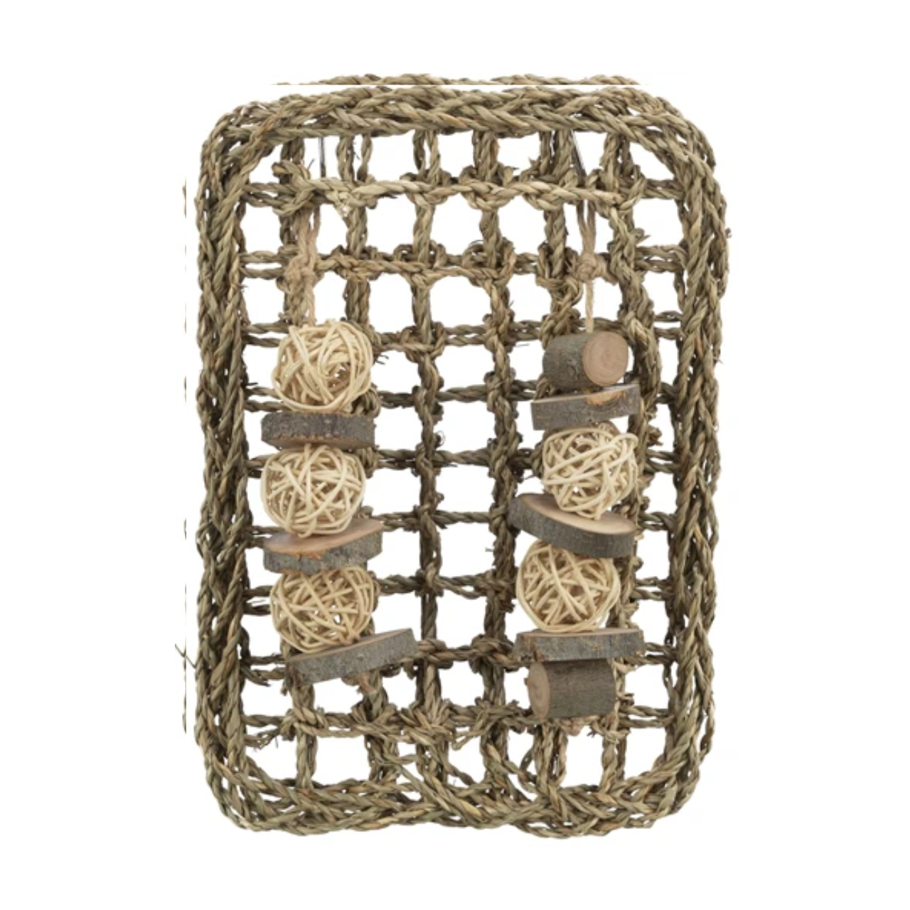 Chew and play: The woven seagrass invites gnawing, while the wooden and rattan balls provide extra fun.