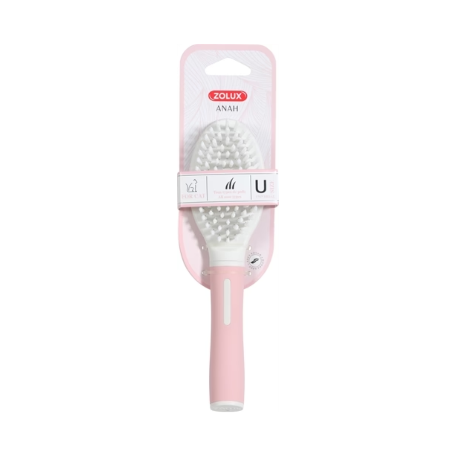 The Zolux Anah Brush is a soft, universal brush suitable for all hair types. The soft bristles effectively remove loose hair and tangles, while leaving the coat soft and shiny. The soft-touch handle fits comfortably in the hand, and the stylish pink and white design makes the brush a beautiful addition to your grooming routine.